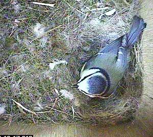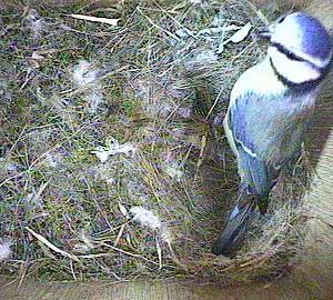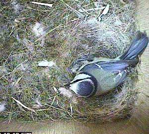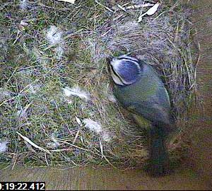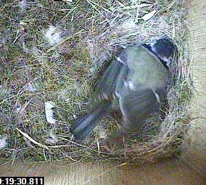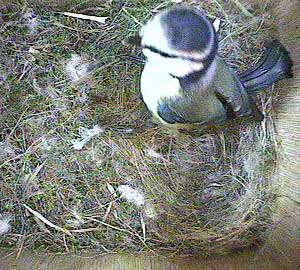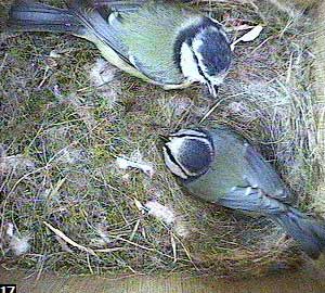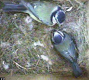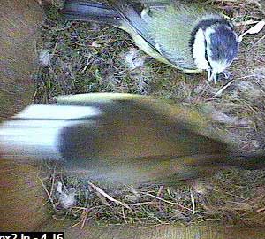 The two bluetits are face to face in the nest box, the original bird still in the nest cup and the newcomer facing her just a short distance away.