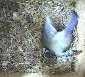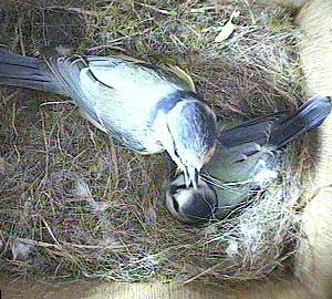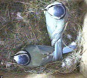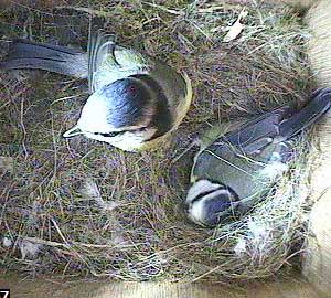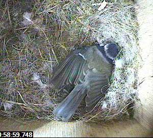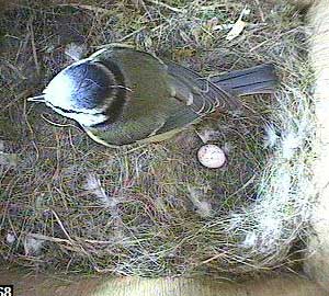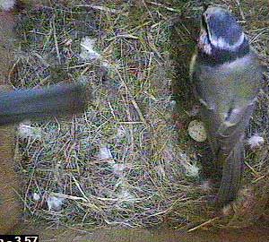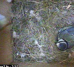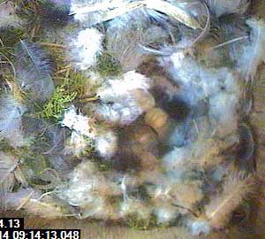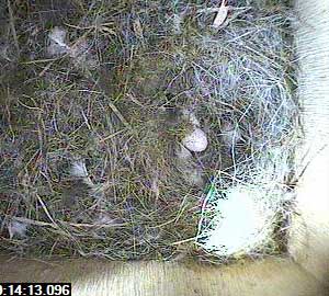 Here in Box1, you can just make out two eggs. This means that the first egg was laid yesterday. We have searched long and hard for a view of Georgie's first egg, but so far have not found one. Georgie has brought in so many feathers that even she must have difficulty seeing her eggs!