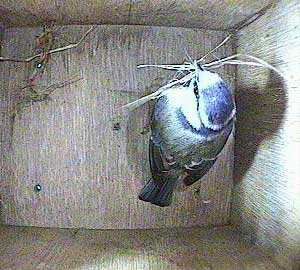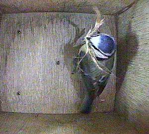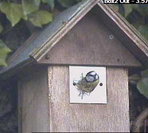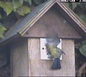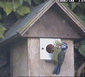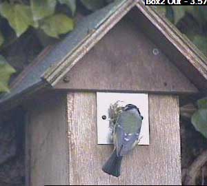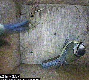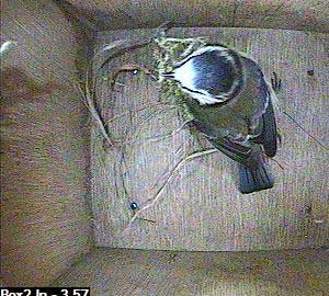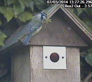 There is something a little odd about Box2. So far we have only seen one bluetit at a time in that box and had assumed that it was the male that we had been missing. Now we are wondering if we have two females competing for the box.