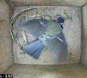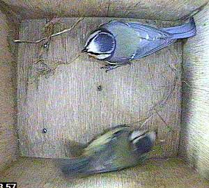 A few minutes later, one bluetit is in the box when another comes to the nest box hole. This doesn't look like a welcoming male to me! The bird's posture looks more like a defensive one rather than an 'I'm keeping out of the way here' one.