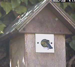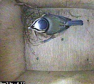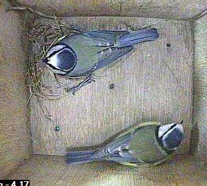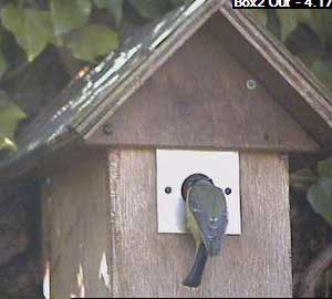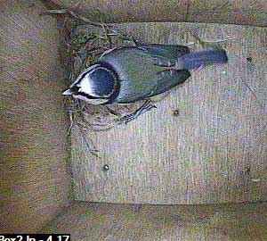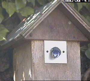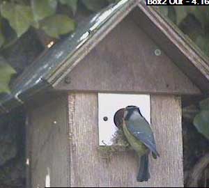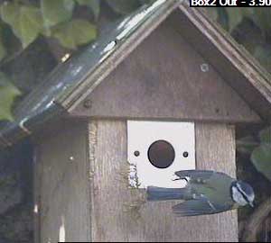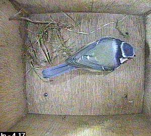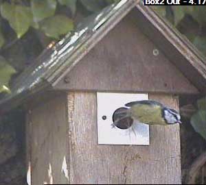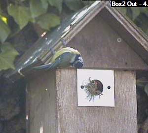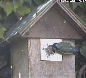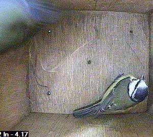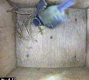Nine minutes later, another bluetit approaches and flies straight into the box. This must be the one that is bringing the nesting material.