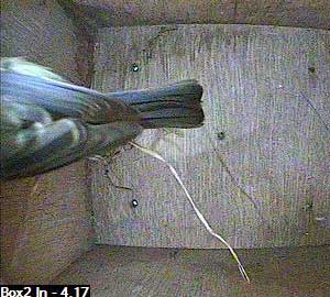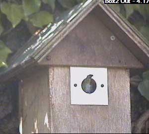 Six minutes later she, or another bird, is clearly a little puzzled by the stuff in the nest box hole.