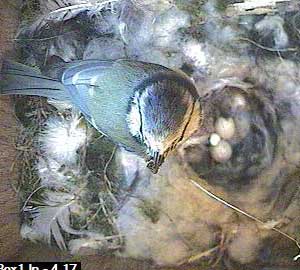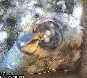 This is Georgie with food in her beak - but she cannot get any response from any of the chicks in her box.