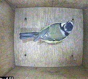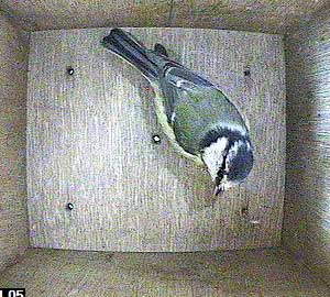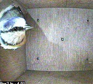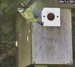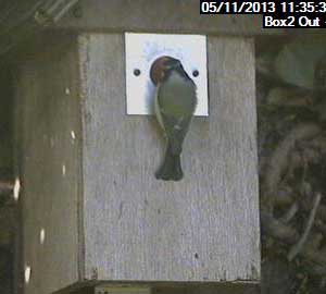 After a few minutes inside the nest box, he flies off. It was less than 2 minutes since he first approached it.