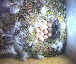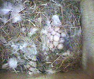 Another shot of the eggs. With two females looking after them the periods for which neither female is in the nest box are few and far between! However, I think there are 14 eggs here.