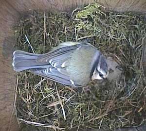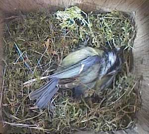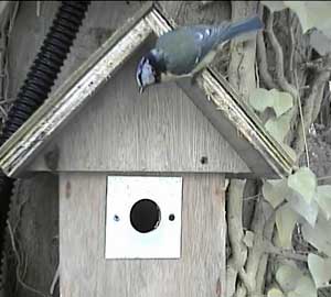 This is Box1. Although one of our bluetits often visits, the nest has not been completed and there are no feathers in it. The wooden bottom of the box is clearly visible where the egg cup will be.