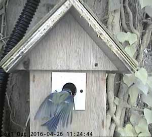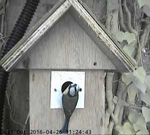 One bluetit is inside Box1 and another is on the entrance hole outside.