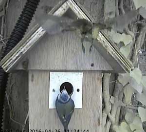 One of the two birds then returns to the entrance hole. I guess from what happens subsequently that this is the attacker.
