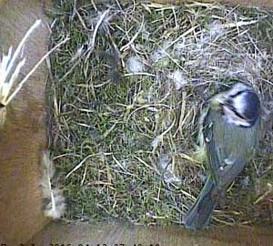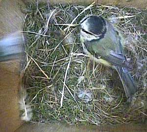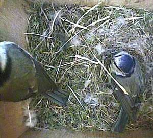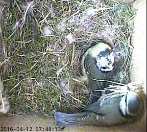 Suddenly, another bluetit appears at the entrance. She isn't made welcome by Spikey!