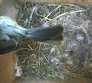 Mission accomplished (well part of it anyway) she starts to leave the nest box. Spikey still doesn't act as one would expect a female to act when her territory has been invaded. She just watches Bess go.