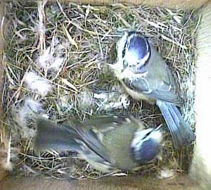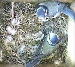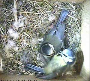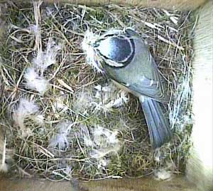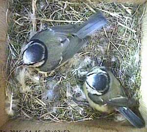 We start this sequence with a bluetit in Box2 with a feather in its beak. But which female is it?