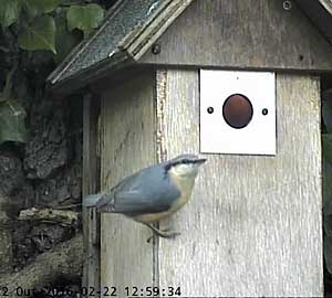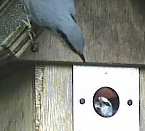 This nuthatch is clearly looking for a nesting place and is examining the entrance to Box2. The hole is much too small for it but it doesn't get a chance to investigate this.