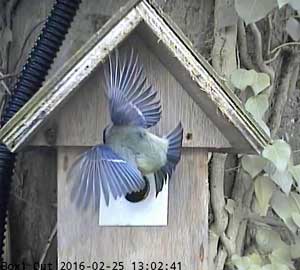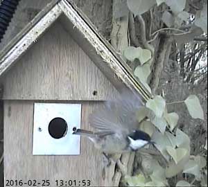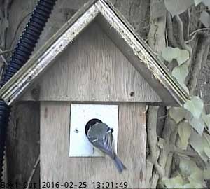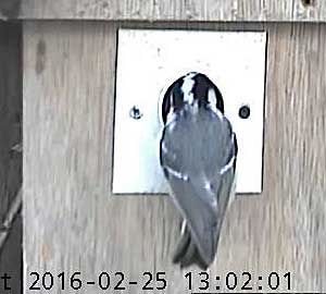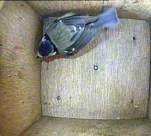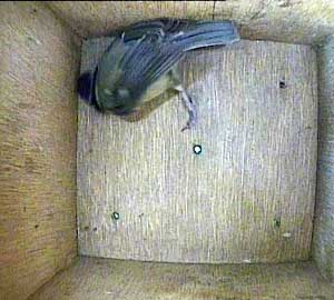 Having settled on the roof of the nest box, it had to do a somersault to get inside.