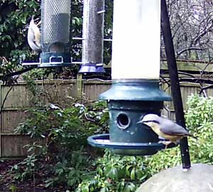Unfortunately, this second camera appears to have a very wide angle lens - too wide an angle to be suitable for mounting there. I am therefore using it to monitor one of the bird feeder poles that have several feeders on and it was this one that caught this picture of a pair of nuthatches. I wonder whether they have ever considered nesting in a tit box? (I would have to make the hole significantly larger to enable them to get in!)