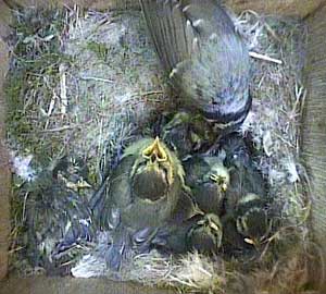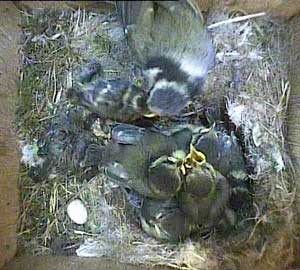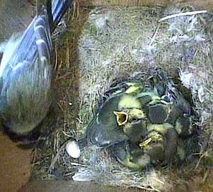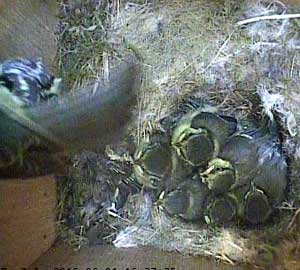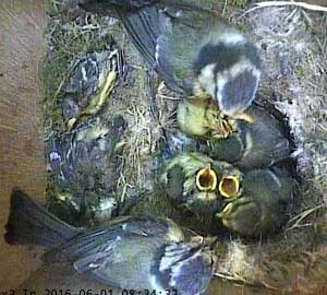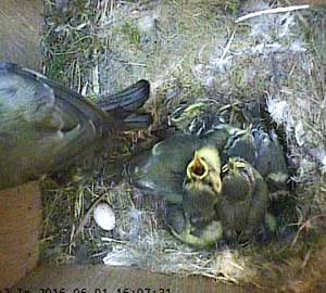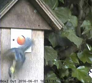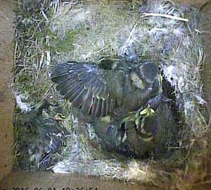 Once she has got it there, she leaves it and look set to leave the nest box! You may just be able to see its feet in the air at the top of the nest cup.