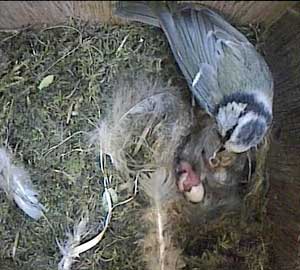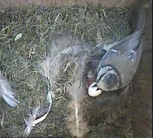 Poppy is eating a piece of eggshell. Whether this is from the second egg or a third chick has hatched is not yet clear.