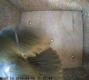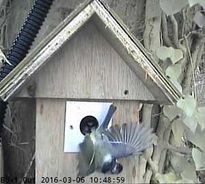 We have seen this tactic by the bird inside the box several times before and puts the attacker at a severe disadvantage. It is too close to the box to get away by flying and it appears it finds it very difficult to release its leg from the other bird's grip.