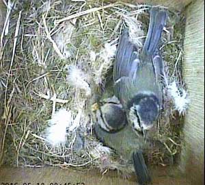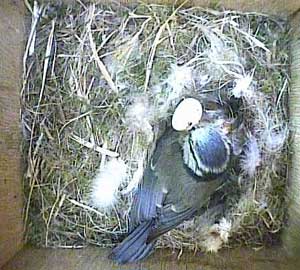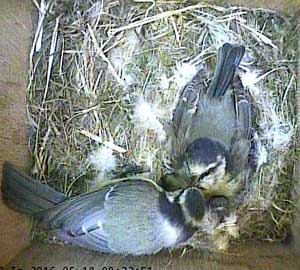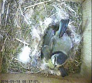 The final two pictures today show the state of the other two nest boxes. In Box1, there are now at least two eggs. Two eggs would imply that the first one was laid yesterday (Tuesday 17th May). Poppy only just finished her nest building in time!