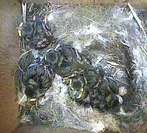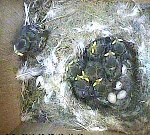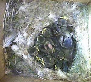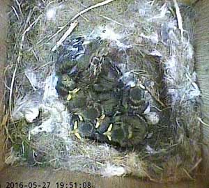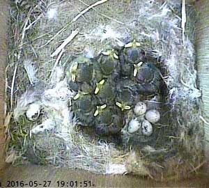 Eight chicks looking fairly relaxed, and all facing the entrance hole, with mum sitting awkwardly on the far side of the nest cup.