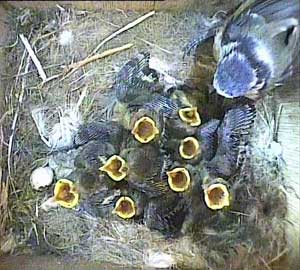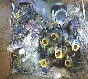 At least this display enables us to see how the chicks are developing. Feathering is growing up their wing pins and you can see here that their eyes are now open. Anyway, I presume that a chick wouldn't wander of its own accord if it couldn't see!