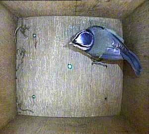 I have made a couple of comments to the effect that Gerry looks quite an old bluetit. This image is a close-up of Gerry about to leave the nest box, and shows her rather tired head plumage. As well as her head feathers, those that cover her body are not the sleek feathers of a young bluetit and remind us very much of Spikey, one of the two females that graced this nest box last year.