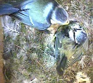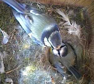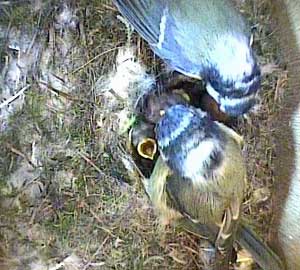 A chick is trying to swallow it, but it is so large that it gets stuck half way down. Here you can see part if the caterpillar is still sticking out of the chicks beak! Bella tries to remove it but it is too far down its gullet and all she succeeds in doing is lifting the chick off the ground!