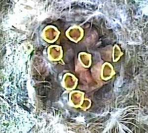 Ten chicks can be seen here. One is a little tricky to see. It is partly hidden by the second gape on the left hand side of the picture.