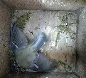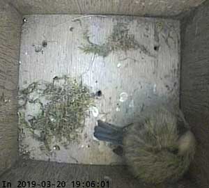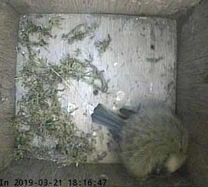 Here's Ann, curled up in a ball for the night in the corner of Box1. Let's hope the nesting material will survive her early morning activities!
