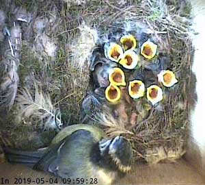 In the ten minute period starting at 10 o'clock, I counted 19 visits from a parent with food - that's almost one every 30 seconds. No wonder these chicks are thriving!