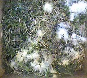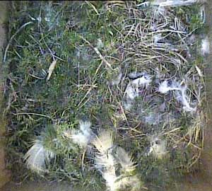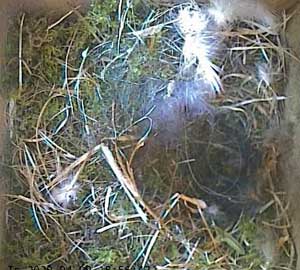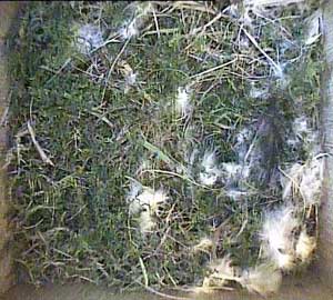 Daisy in Box2 has more or less finished her nest. She has finished it off by finding and bringing in some feathers, most of which appear to be white, but here she is with a beak full of hay.