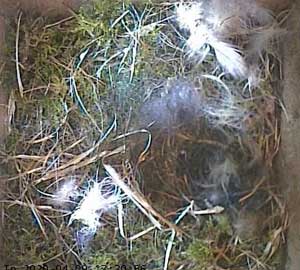 Feathers! It is now the late afternoon, and clearly Chloe has been busy today. As well as some white feathers, she seems to have found some black ones which she has unfortunately left in the nest cup. I say unfortunately because it will make our task of monitoring her egg laying more difficult!