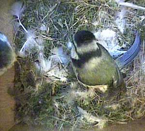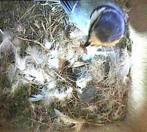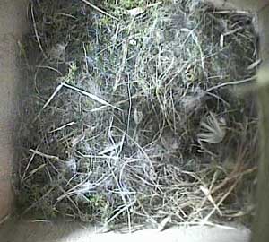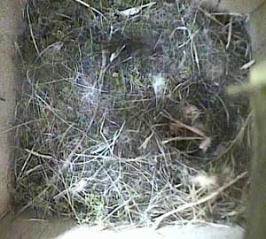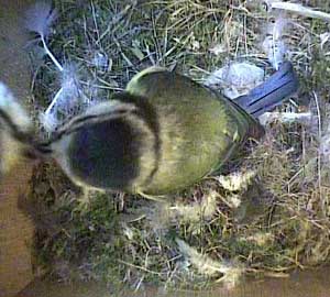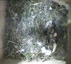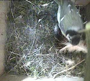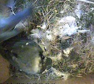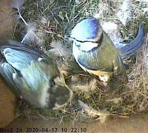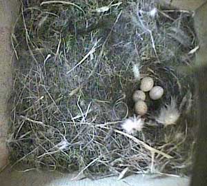 Hurrah! A clear picture of several eggs. As today is Sunday 19th, and there are clearly only 4 eggs in the nest, it is unlikely that what I thought was an egg on Sunday 12th could have been one. Once a female starts laying her clutch, she lays one egg each day, so this clutch must probably have been started on Thursday 16th April. I have known a single day to be missed, but not four! Still, I suppose it is possible! We shall see what happens over the next few days!