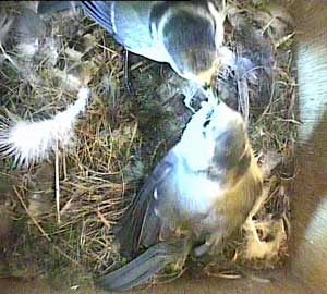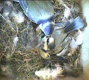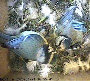 This later picture is not much better. I think you can clearly see five eggs and the white blob on the left of the clutch could be a sixth! However, if I was right to say there were exactly 4 eggs in this box on Sunday 19th, then this must be 5, not 6! Bluetits (and birds in general) can only produce one egg each day!
