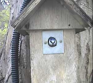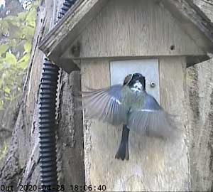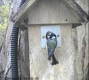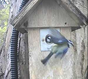 He clearly has some food for her, so he flies down to the entrance hole ...