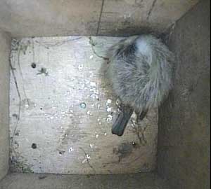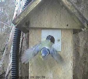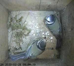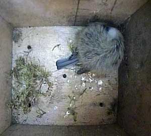 This is Chloe curled up in the corner of the box. It must be Chloe as she doesn't leave any mess overnight. Last time there was a bird roosting in this box overnight, it was Chris (or another male) and he left a dreadful mess.