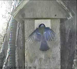 A second bird flies onto the entrance hole. Judging by its appearance, it isn't the inside bird's partner.