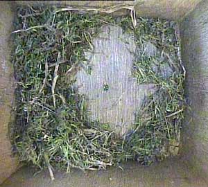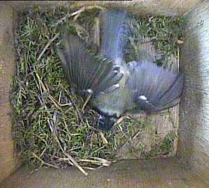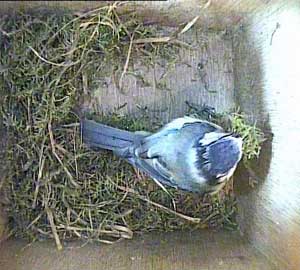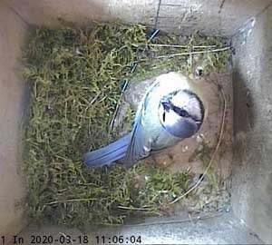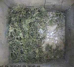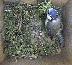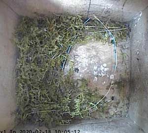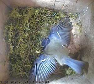 In Box2, however, Daisy is still bringing moss into the nest box. Here she is with another load.