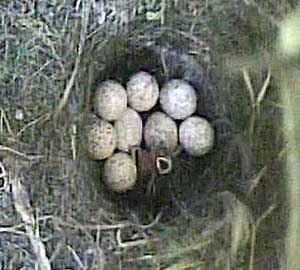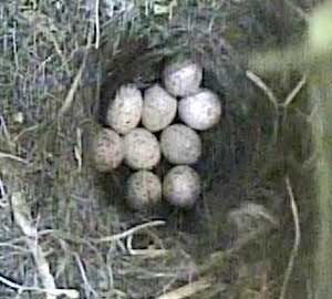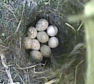 You can't see all the eggs here because of the feather, but at ten past seven, eight of them are still intact!