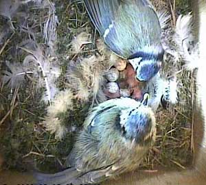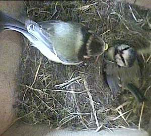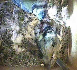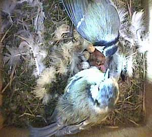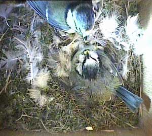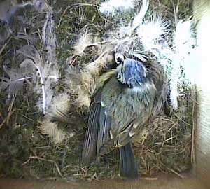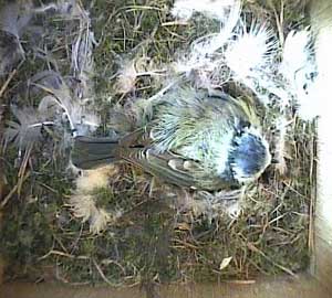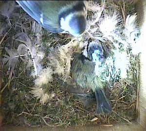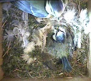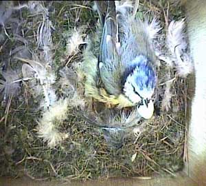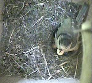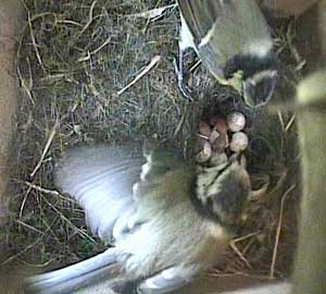 Twenty minutes later you can see Daisy with a piece of eggshell in her beak. Bluetit mums always seem to eat the eggshell of the first few eggs to hatch. As well as disposing of the shell, this helps her to replace the calcium in her body that was used to create the eggshells. This clutch of 9 eggs represents a lot of calcium for a small bird to produce.
