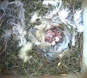 Daisy has got off the nest cup so that Drake can try to feed the chicks.