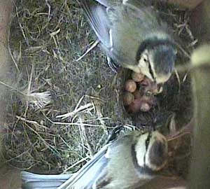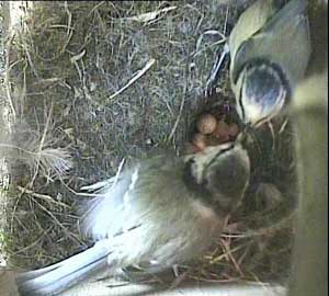 She eats the eggshell as female bluetits often do.