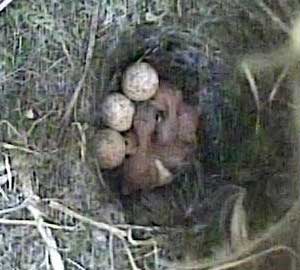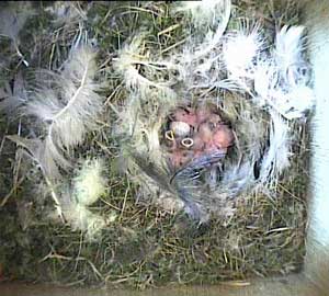 At this stage the chicks cannot see. I'm not sure whether they can hear either! The ejected chick therefore careers off in the wrong direction - away from the nest cup.