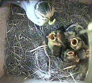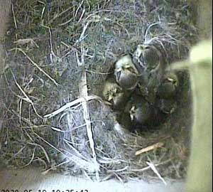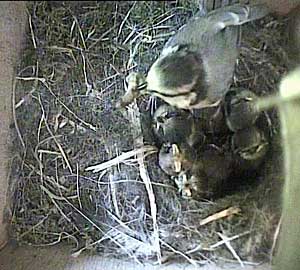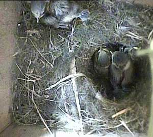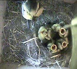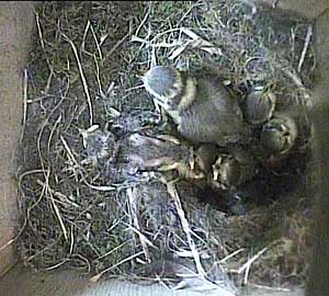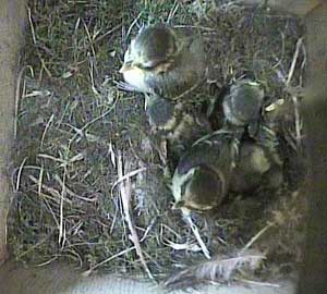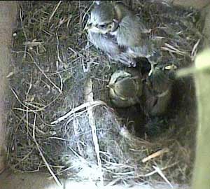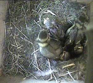 Comparing sizes of the chicks in these photographs is very difficult, as the camera lens is a very wide angle one and that can cause chicks which are further away from the lens to look significantly smaller then those that are nearer. Here you can see Scrap out of the nest cup and nearer the lens than the chicks inside it. Even so, it looks much the same size as the other two chicks in the picture, which means that in fact it is much smaller than they are!