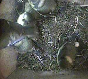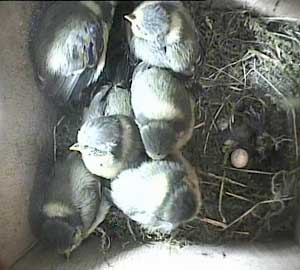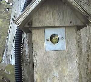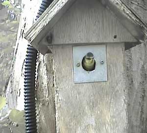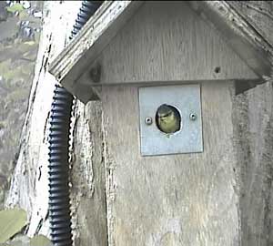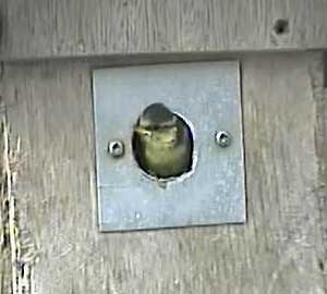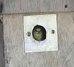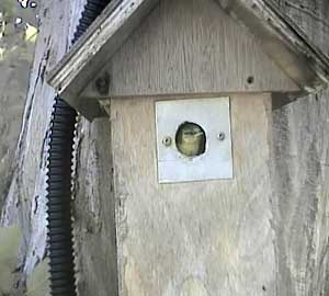 Here he is looking out of the nest box hole. You can tell this is a chick rather than a parent because the feathers on his face and chest are yellow, rather than white.