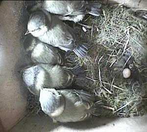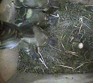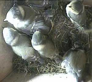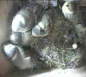All the rest of them look on without much enthusiasm. I can well imaging that if this chick does eventually fledge today, the rest will stay in the nest box at least one more night.