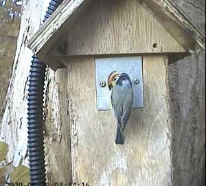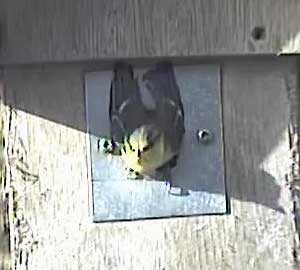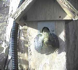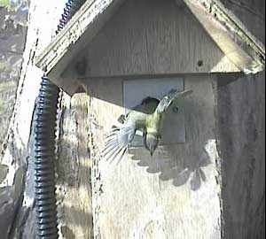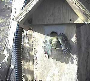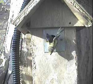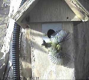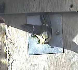 Chloe brings food to the nest box and decides to feed the chick in the hole rather than go inside.