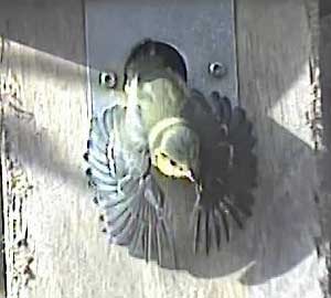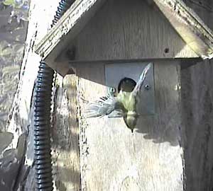 She soon forces her way into the nest box - presumably to see how the chicks are getting on.