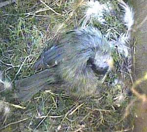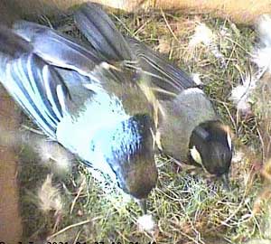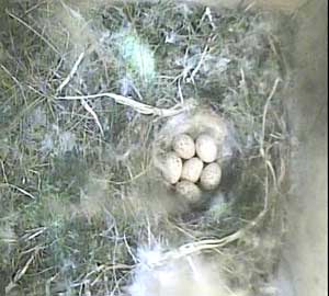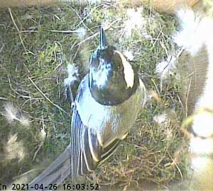 Here she is hunkered down and shouting to try to keep the bird outside from coming in. Unfortunately, I cannot show you the view from outside as the camera has drifted so much to the right that you cannot see the nest box hole.
