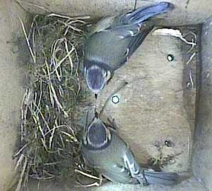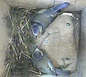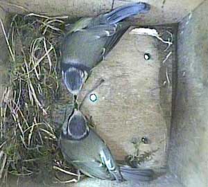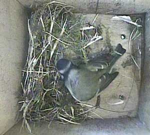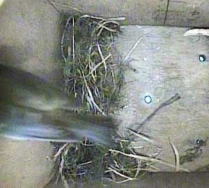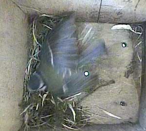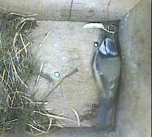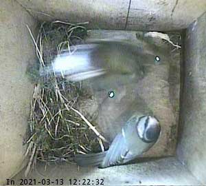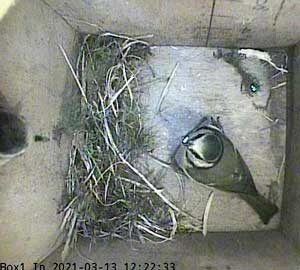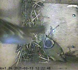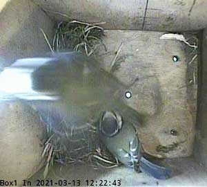 Again, he goes into the box. You can see that he still has something for her in his beak.