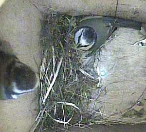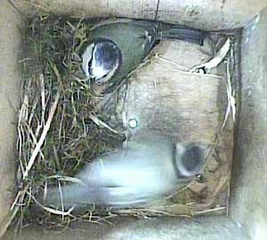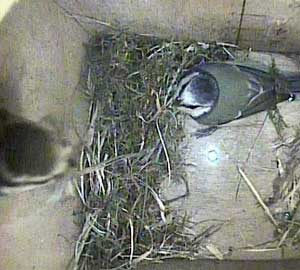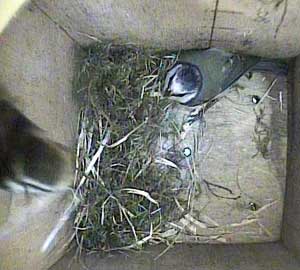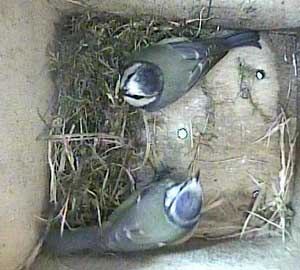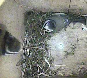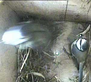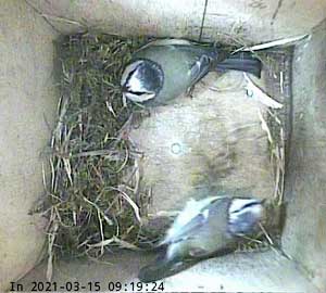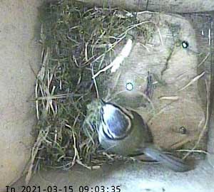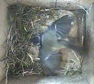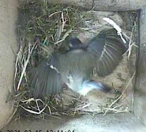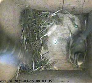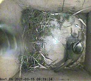 Ella bringing in more nesting material while Ernie is still in the box.